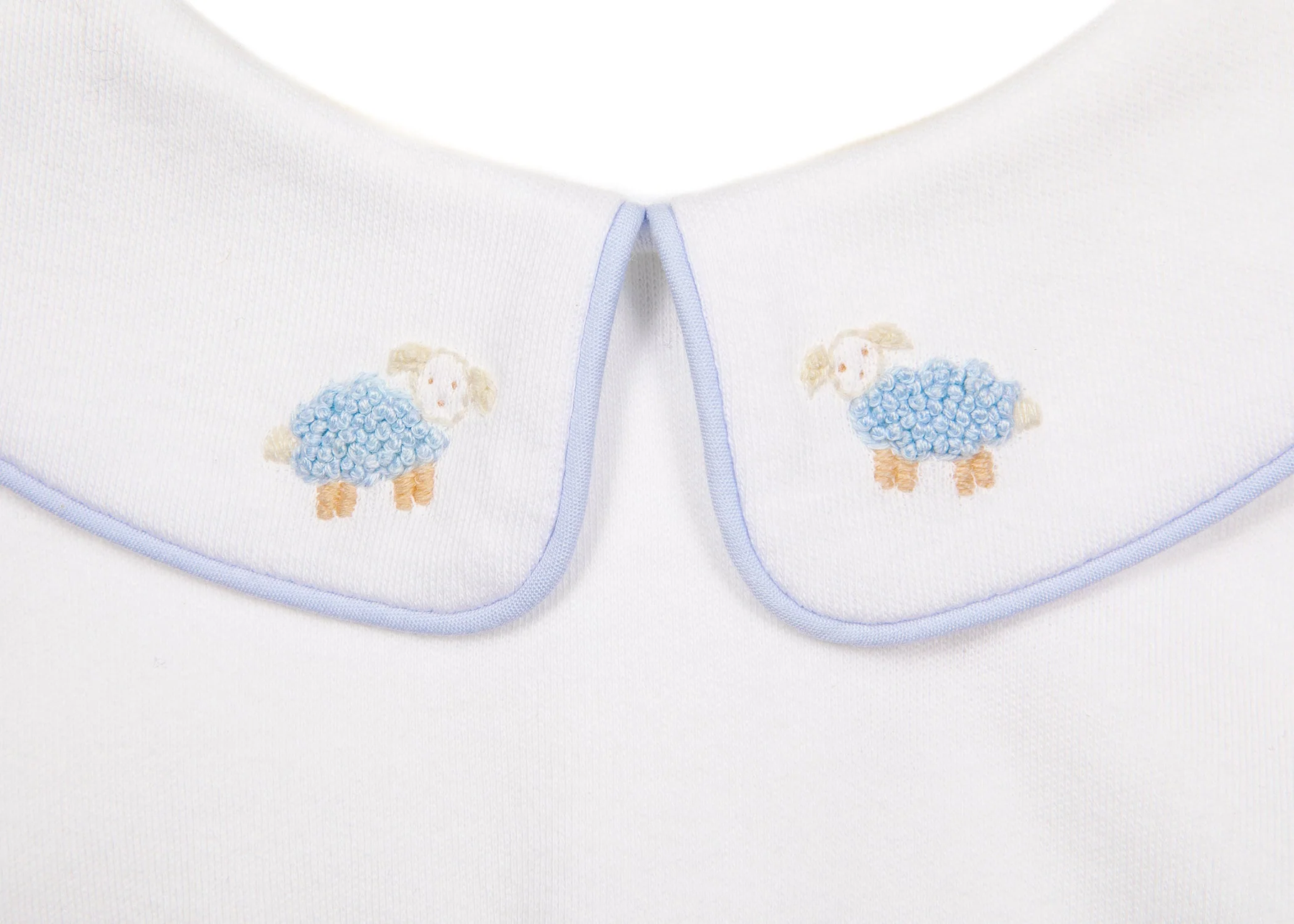 The Little Bo Peep Footie is made with a pima cotton knit that feels great to your little one. The Peter Pan collar has hand embroidered french knot sheep and is piped to match. The snap button back and legs make for an easy on/off and the built in mittens set this footie apart from the rest. Cozy Comfort.