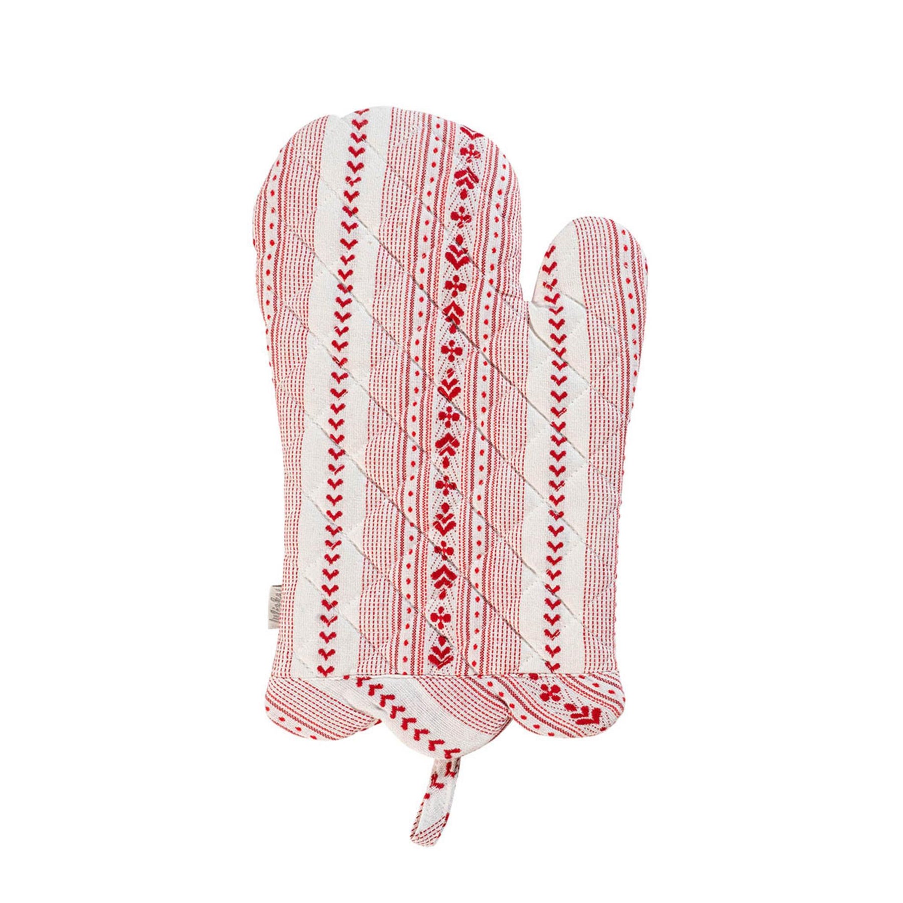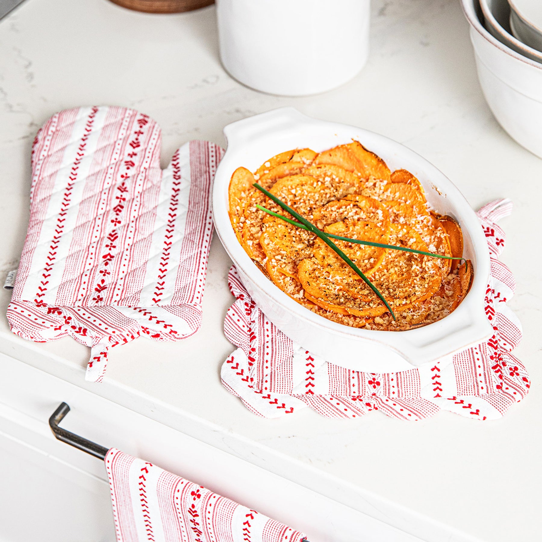 For the consummate hostess, a matching oven mitt and pot holder to complete the Villa Stripe collection, with its red and cream jacquard stripe. Fabulous for holiday entertaining, baking, and gifting!