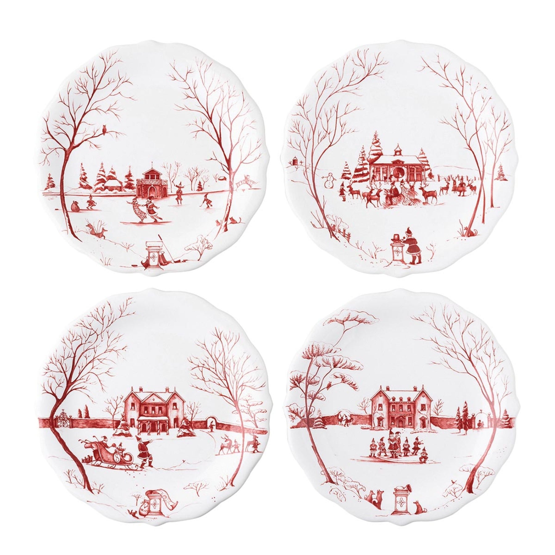 Juliska's charming English Country Estate is snow covered for the holidays! Santa & Merry celebrate with all the North Pole inhabitants. Each of the four charming party plates in this set features a unique scene: